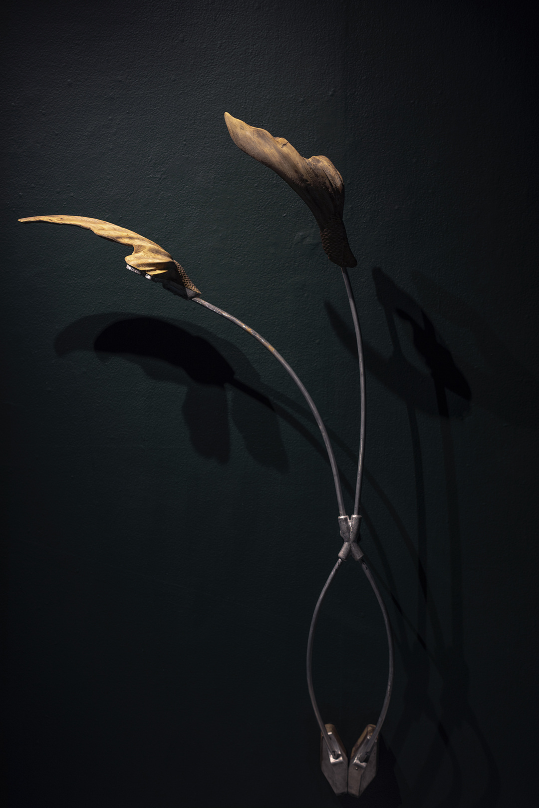 Dancing Fins, 2019. wood, plastic, aluminum, 31” x 65” x 14”